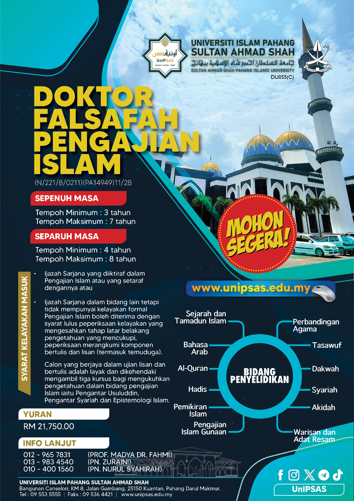 Tempoh pengajian : Sepenuh masa (Minimum 3 tahun, Maksimum 7 tahun)